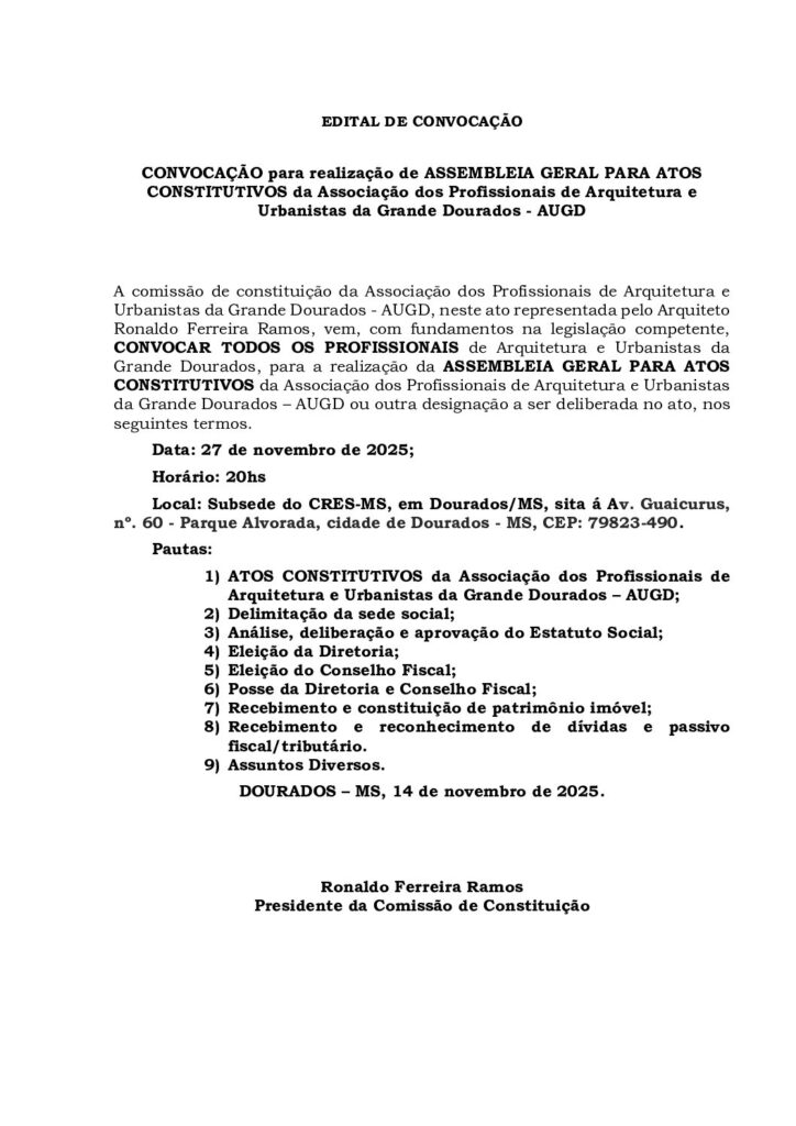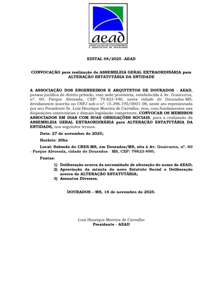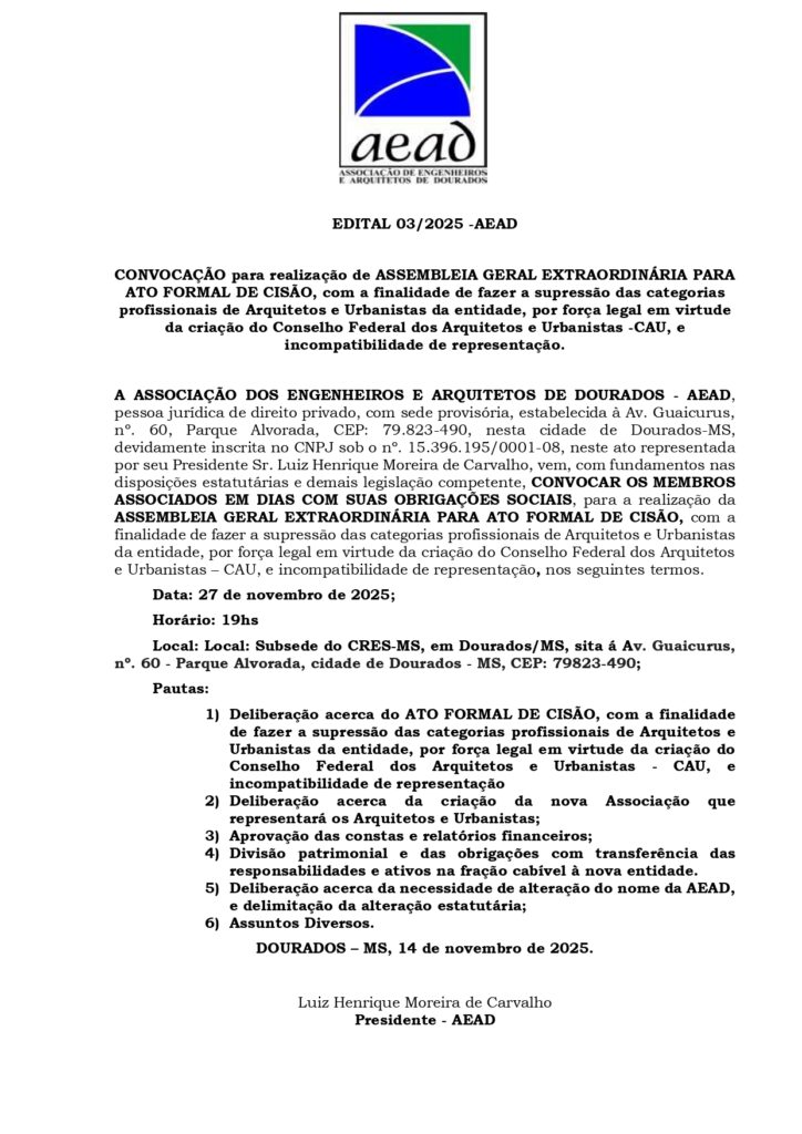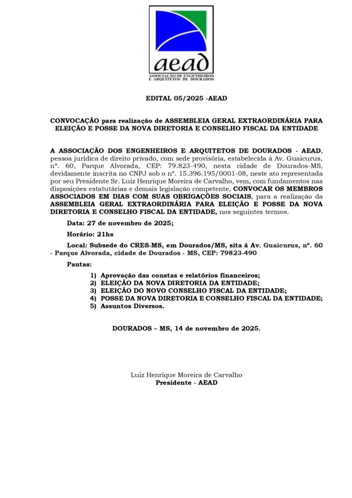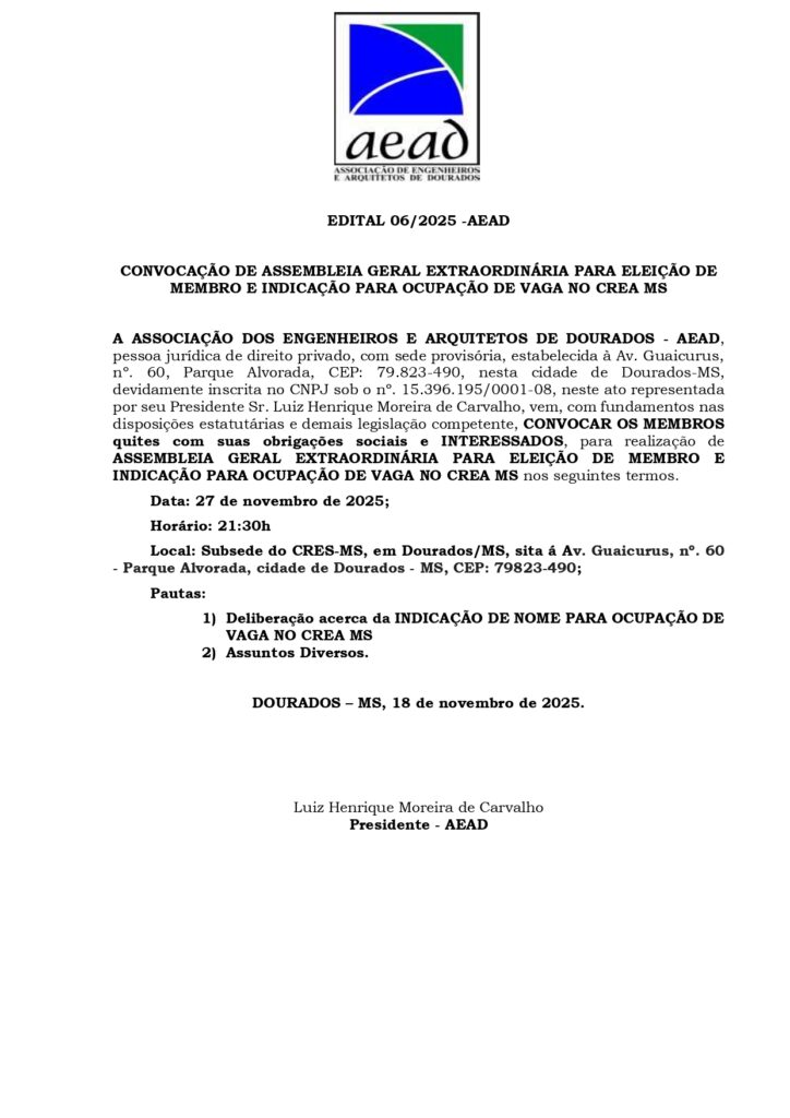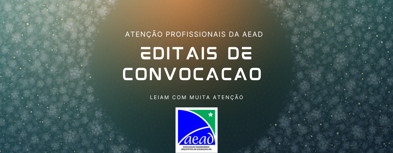 Informamos os profissionais vinculados a Associação de Engenheiros e Arquitetos de Dourados ficarem atentos aos EDITAIS que estão sendo publicados, pois a entidade (AEAD) esta convocando as categorias destes profissionais para deliberar sobre vários assuntos pertinentes e, que irão mudar o rumo da entidade.